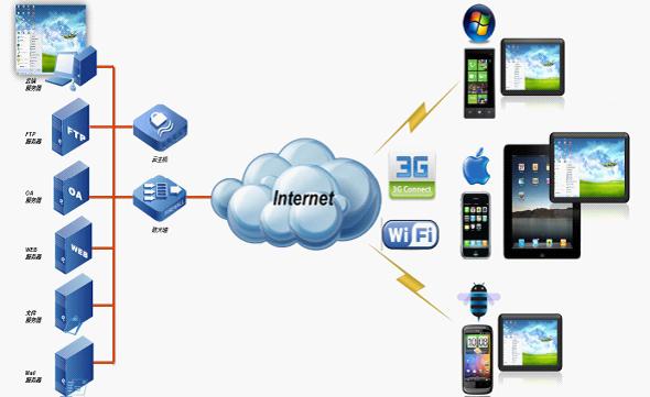 通過網(wǎng)神的3G云接入平臺,用戶可以利用3G智能手機進行安全接入,通過網(wǎng)神的移動客戶端,用戶可以很方便的進行遠程資源訪問,用戶可以任意的使用WINDOWS服務(wù)器上所有資源,而資源原本在手機上是無法使用的,你可以打開ERP或OA辦公系統(tǒng),就像你在電腦上使用一樣。